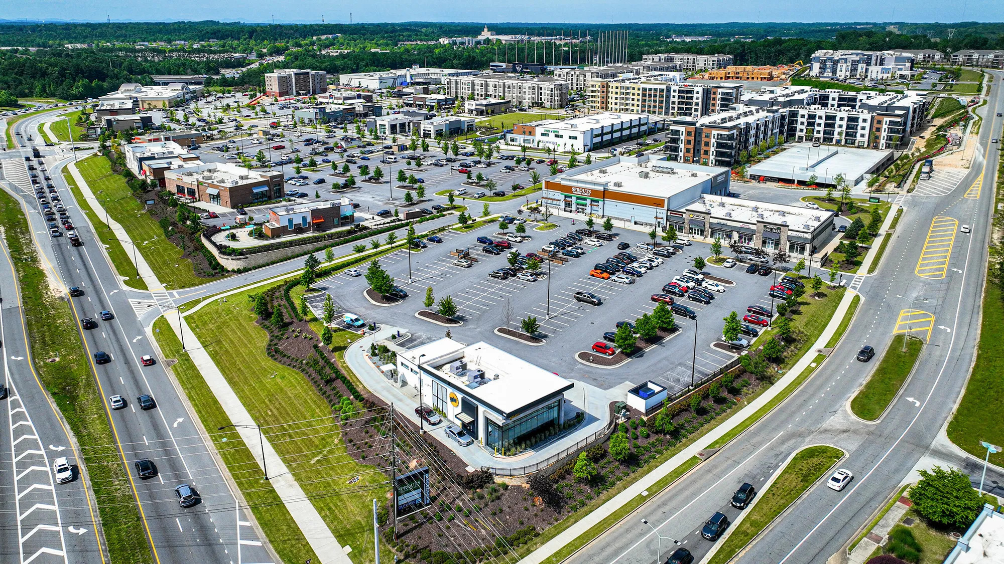 The Exchange at Gwinnett is a high-quality, newly built grocery-anchored property in one of the region’s fastest growing retail corridors of Atlanta GA. The property includes a diversified mix of national and local retailers and restaurants, including Starbucks, Sprouts, Chipotle Mexican Grill, Thrive Affordable Pet Care and Five Guys. The Exchange at Gwinnett is planned to include more than 1,000 apartment, townhome and senior living units and approximately 465,000 square feet of retail, hotel and office, including newly opened entertainment anchors Top Golf and Andretti Racing, and a new 52,000-square-foot Rooms to Go. Pickle and Social offers both indoor and outdoor pickleball courts along with a food pub.
